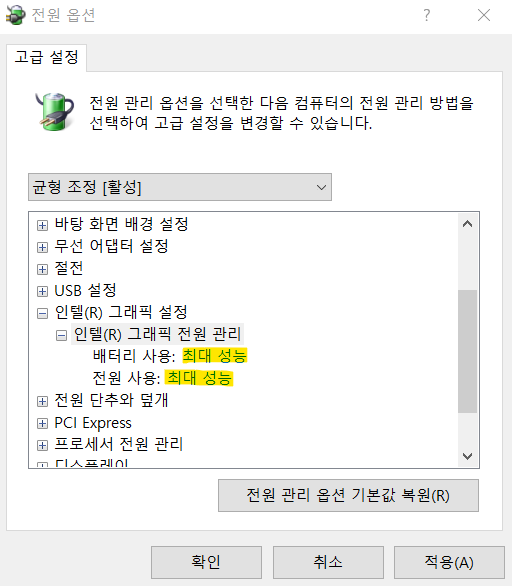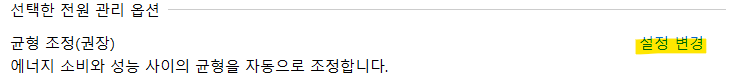그럼 균형 조정으로 두거나 고성능으로 변경해주시면 됩니다.