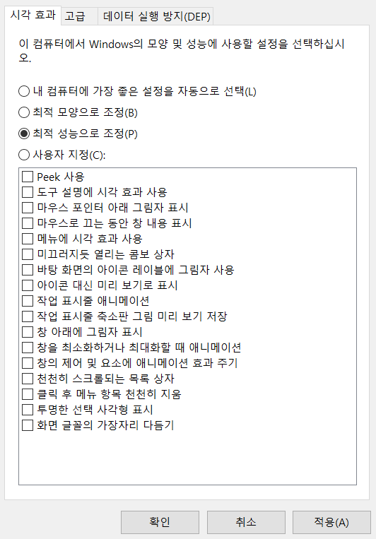 거기서 '최적 성능으로 조정'으로 변경해주세요.