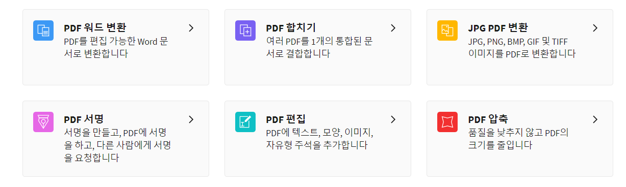 이 중 pdf합치기, pdf를 워드로 변환, pdf를JPG로 변환, pdf압축등 여러방식이있습니다.